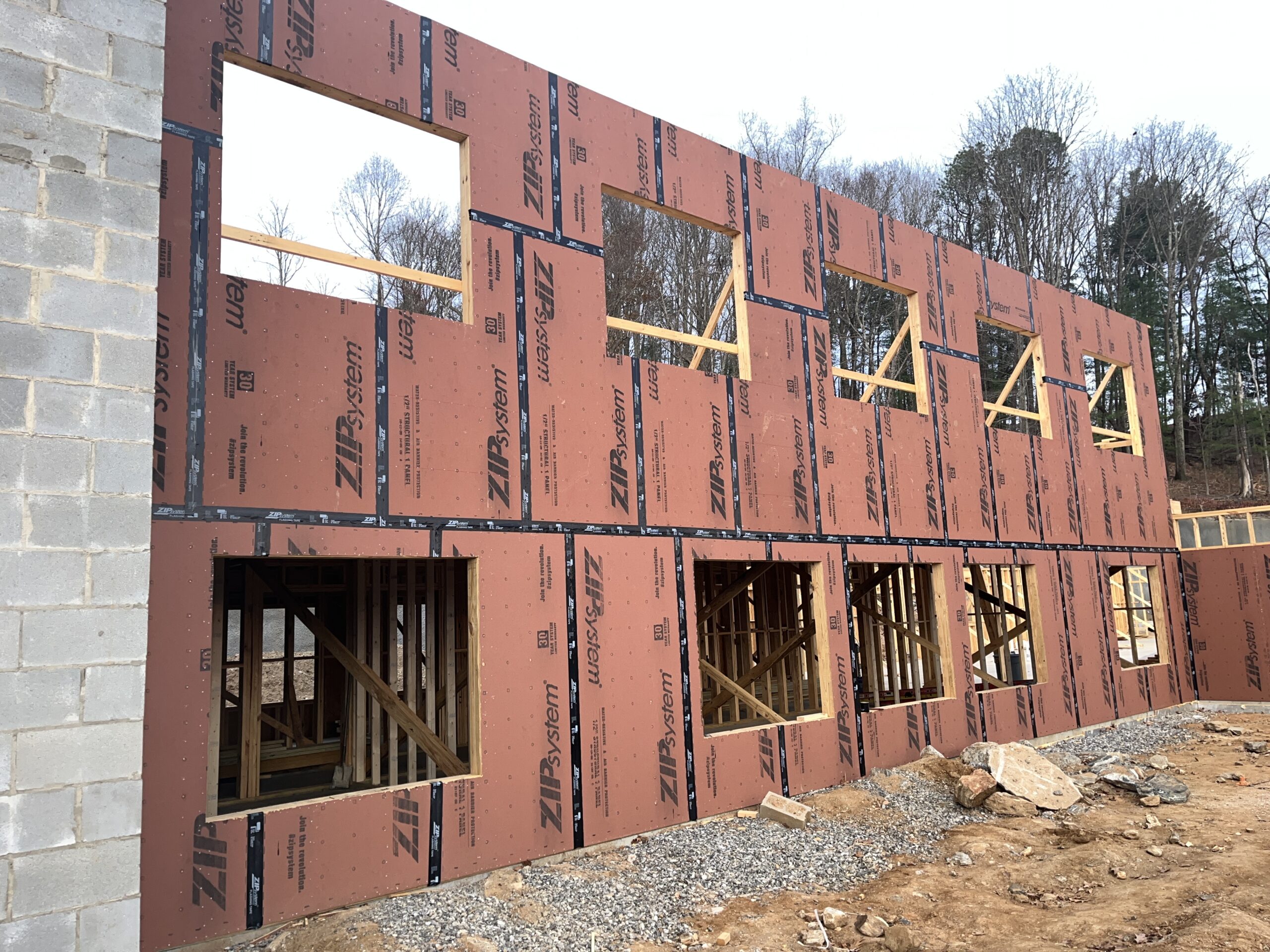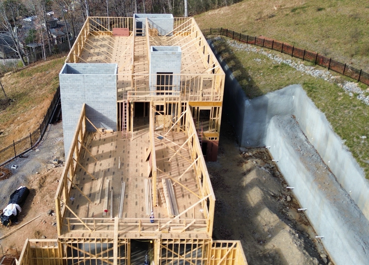 The residential portion of the building is now coming to life—framing and flooring for both the first and second levels are complete. The office area has also reached the same milestone, with its framing, floor trusses, and sheathing finished.