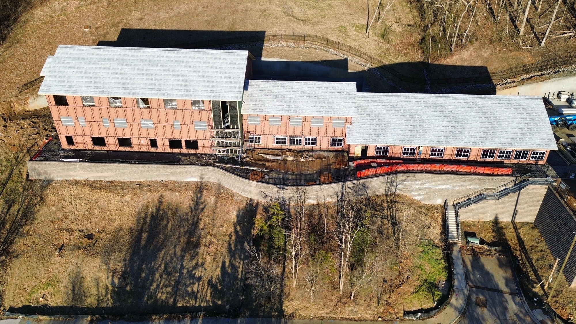 The central staircases are fully complete, providing permanent access throughout the building. On the exterior, installation of fascia and soffit (the finished edges and undersides of the roofline) is underway, giving the building a more complete appearance. Spray foam insulation has been installed along the building perimeter and throughout the first- and second-floor residential corridors, and this work has passed inspection.