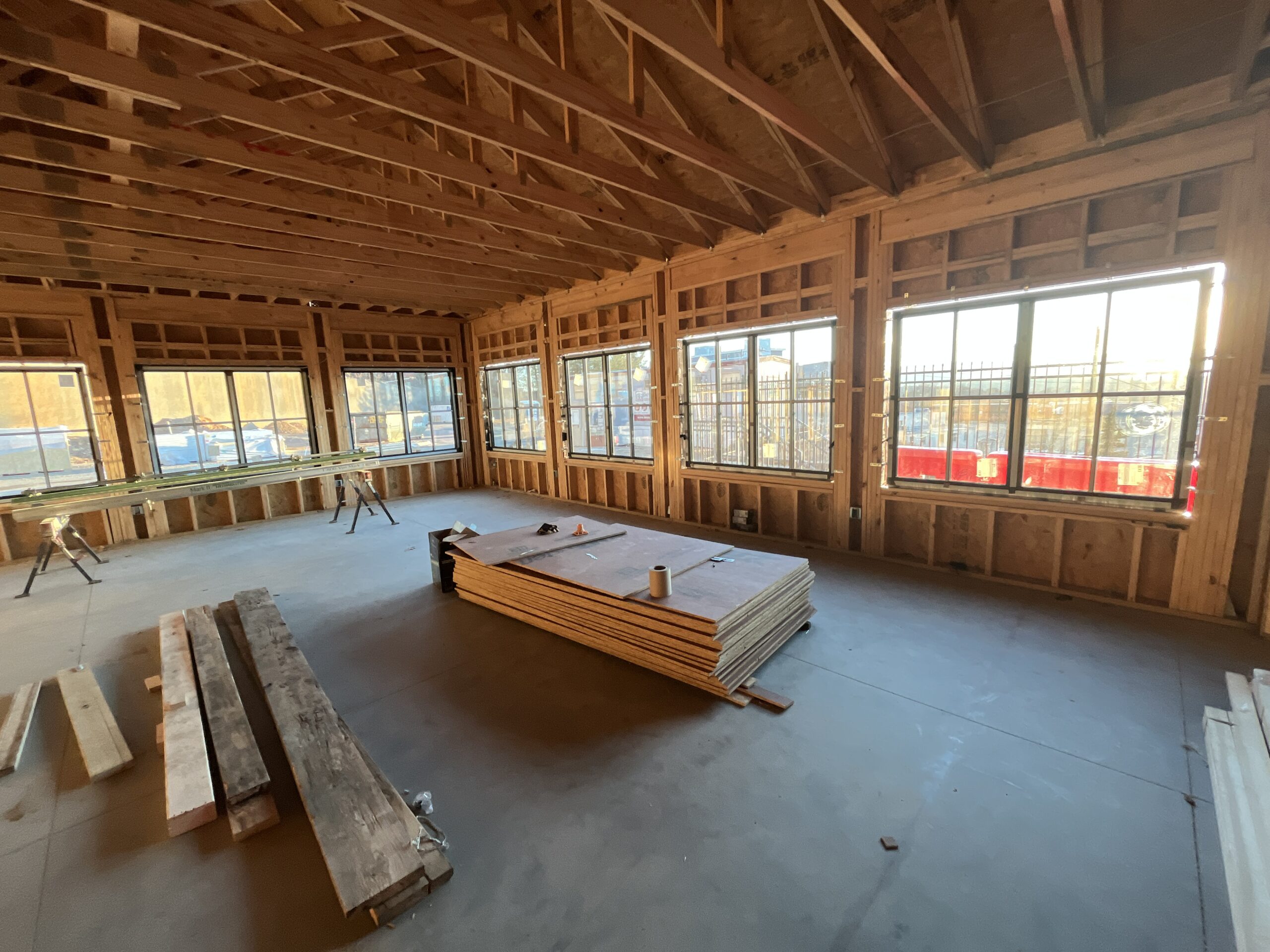 The team at Beverly-Grant has made a lot of exciting progress recently. The structural framing for the residential side of the building is now complete, and crews have begun putting up the interior walls that divide the individual units. Work on the exterior sheathing is also underway — this is an important step that helps protect the building from the elements as we move toward “drying in,” or sealing the structure from weather. Plumbing rough-in began on 11/12, and we expect windows to arrive within the next week to week and a half. Once they’re here, the team will wrap the openings and install the windows so the building can be fully closed in. Electrical rough-in is scheduled to start in the second week of December, depending on how quickly the building is dried in.