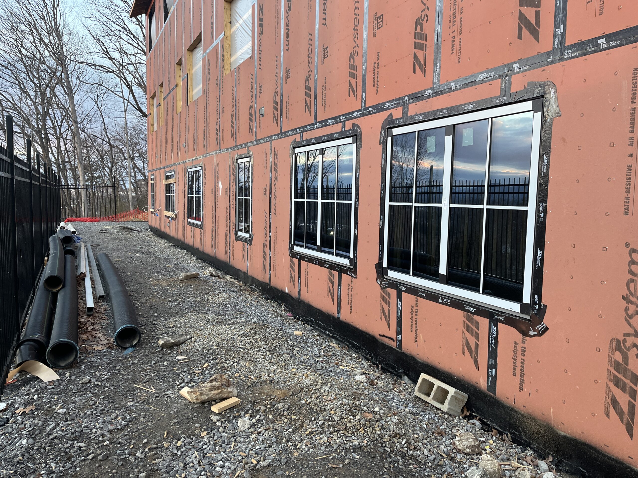 Work is underway to install insulation over the stair towers, which is an important step before the siding can be added. Windows are nearly finished throughout the building, and crews have begun sealing them to protect against weather. The remaining windows in the stairwells will be installed last, which is typical for this stage of construction.