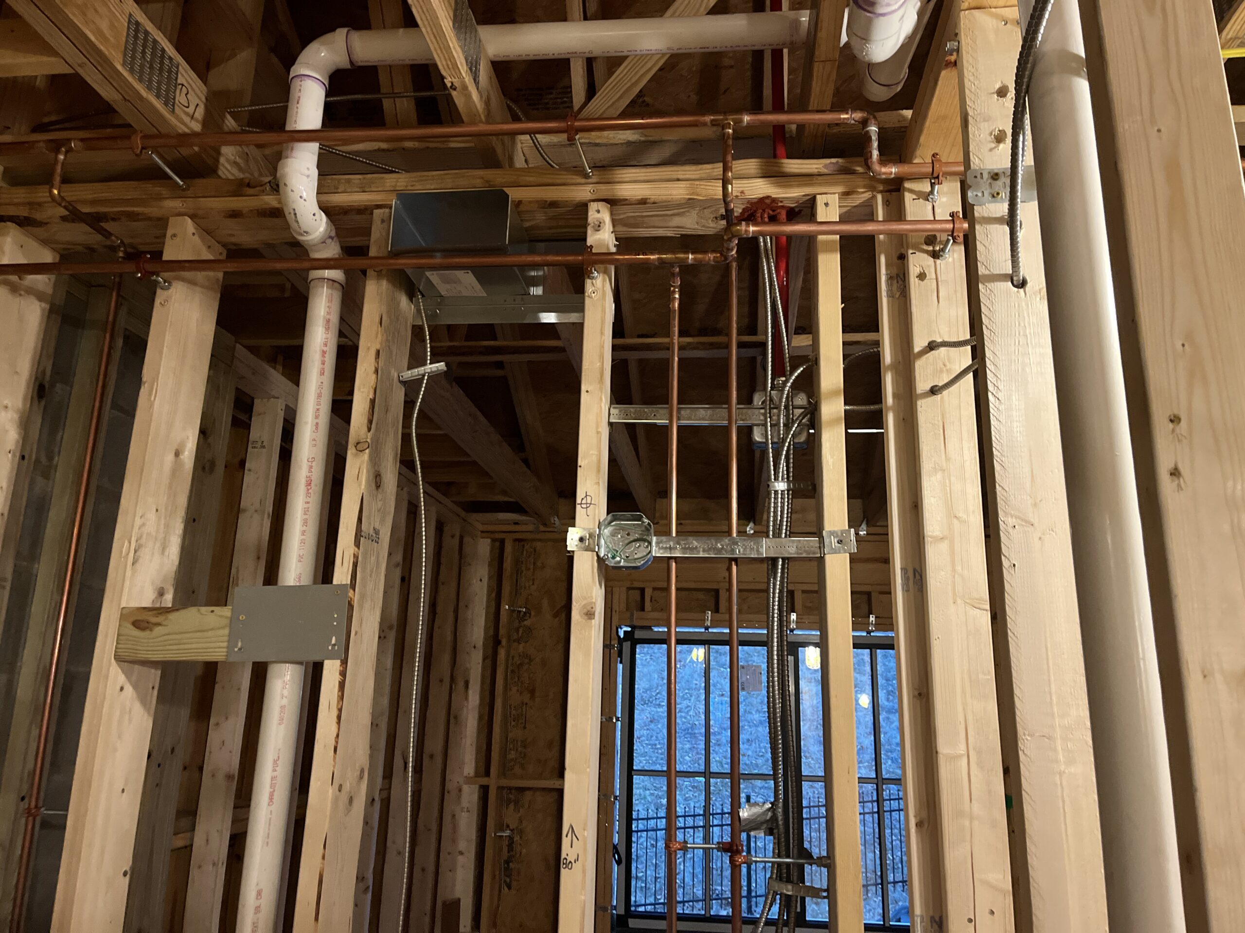 Inside the residential portion of the building, all plumbing waste piping has been installed, inspected, and approved. Installation of copper water lines is now in progress, which will supply water to the apartments. Heating and cooling work is also moving forward, with HVAC venting and ductwork currently being installed.