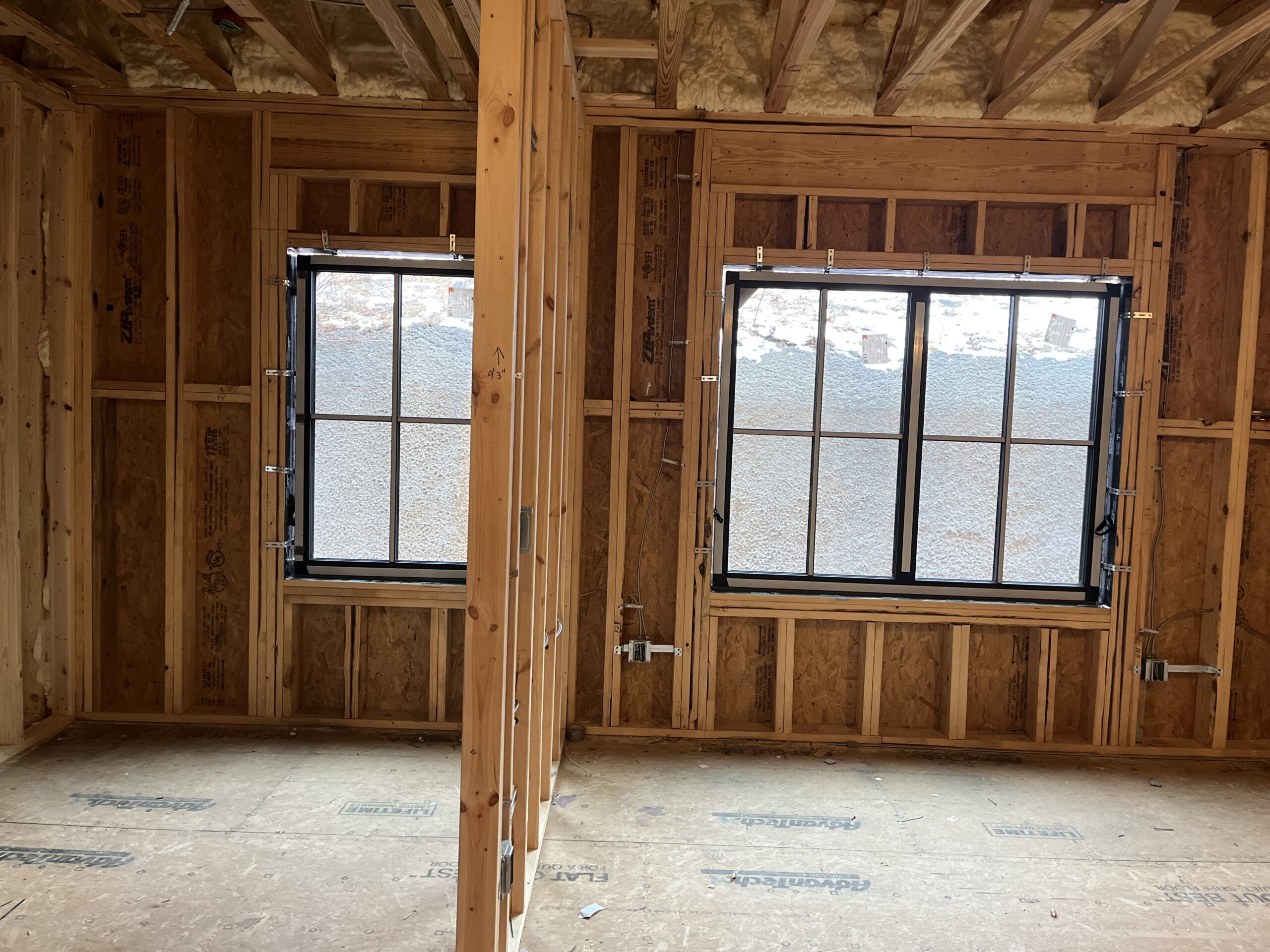 The residential portion of the building is now coming to life—framing and flooring for both the first and second levels are complete. The office area has also reached the same milestone, with its framing, floor trusses, and sheathing finished.